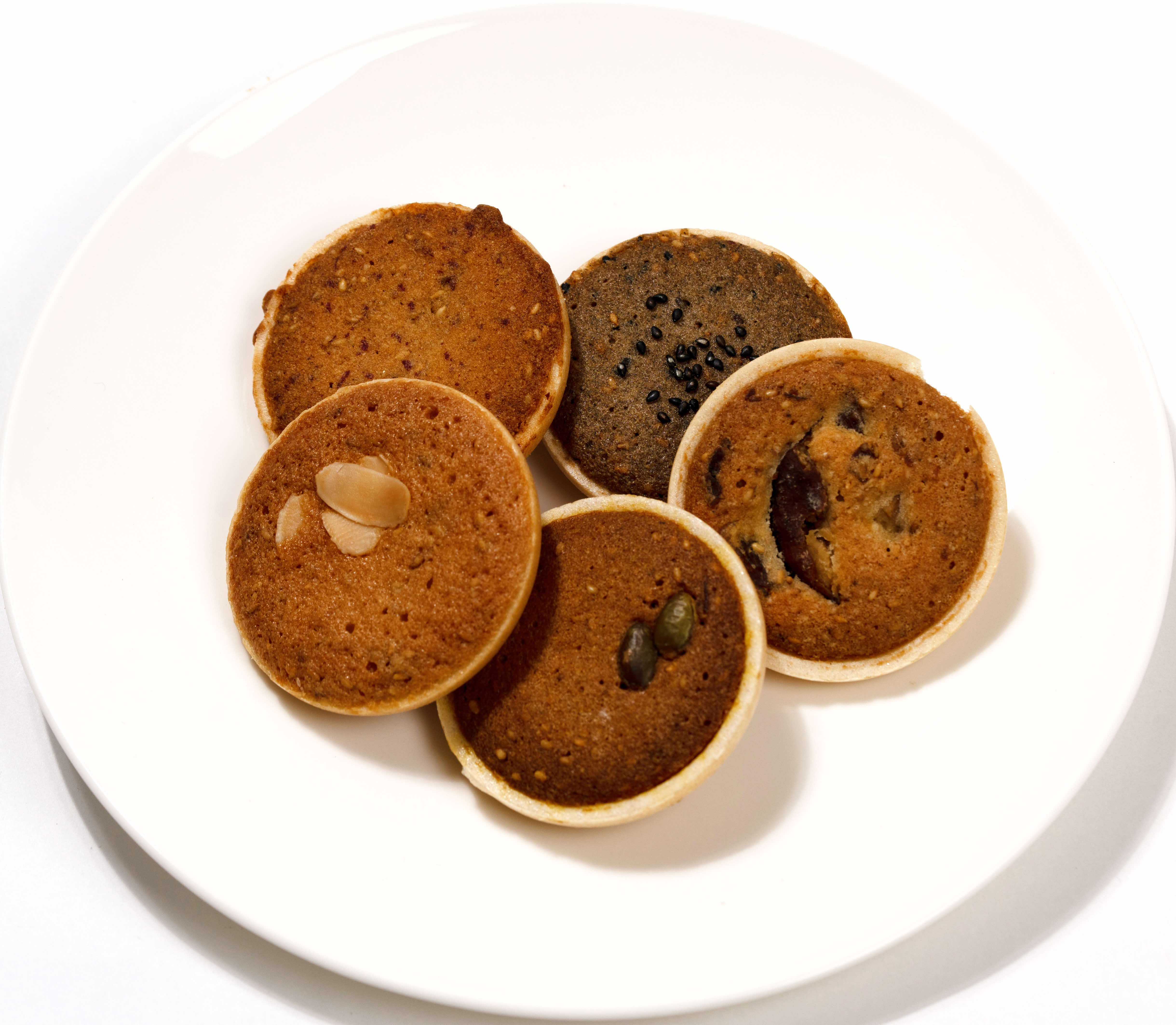 サクッと最中に、三原市産の米粉のクッキーを詰めました。プレーン、かぼちゃ、ごま、芋、栗の5種類があります。