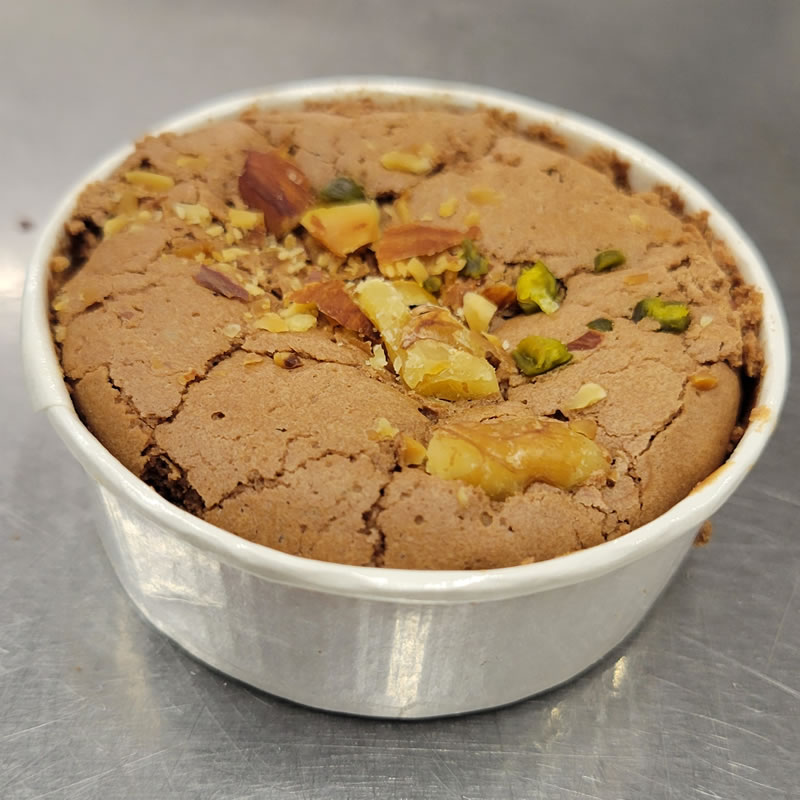 三原市産の米粉を使用した、しっかり濃厚でなめらかな食感のブラウニー。アーモンドやくるみの香ばしさが際立ちます。*写真はイメージです。実際には8等分した商品を販売・お届けします。