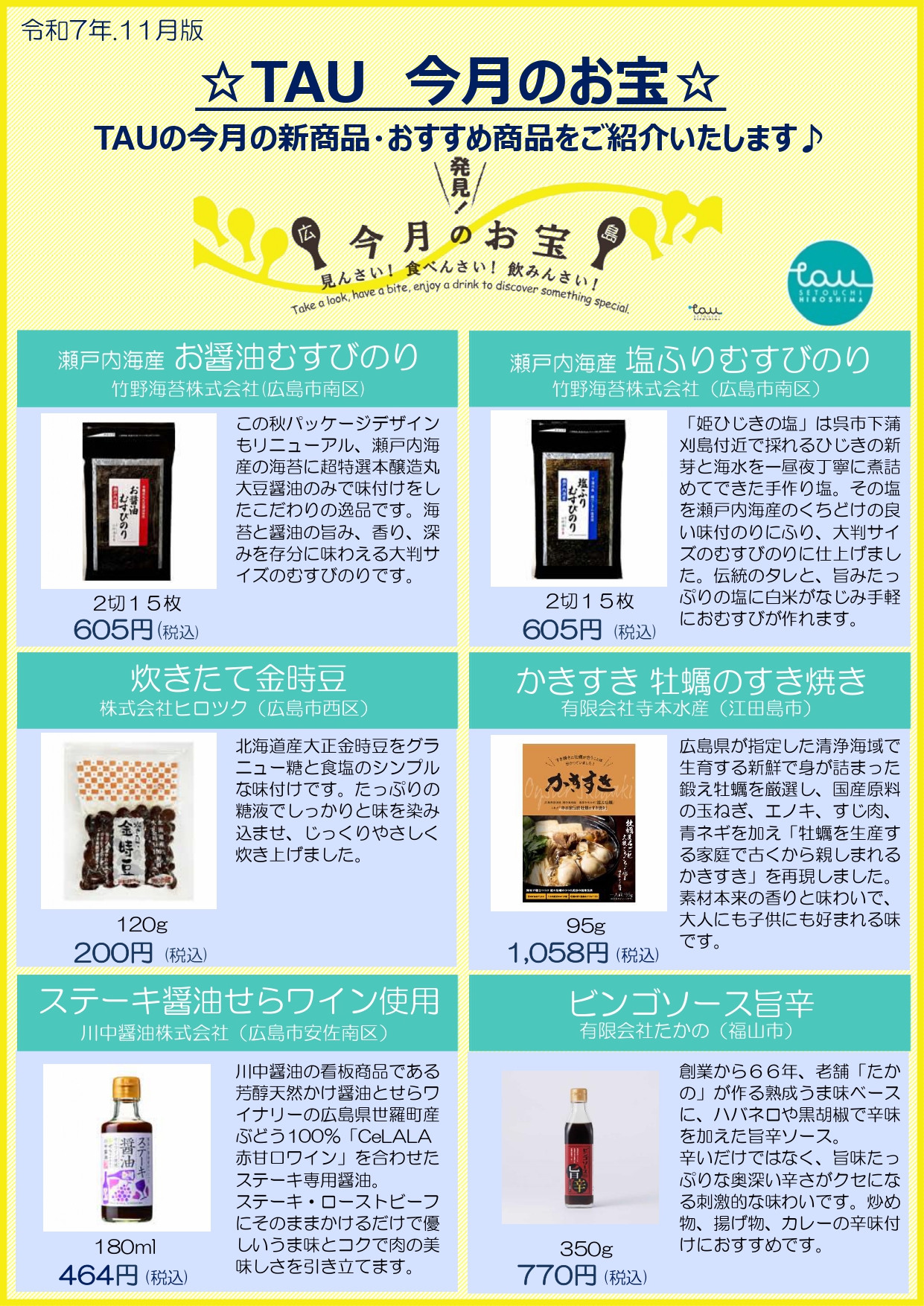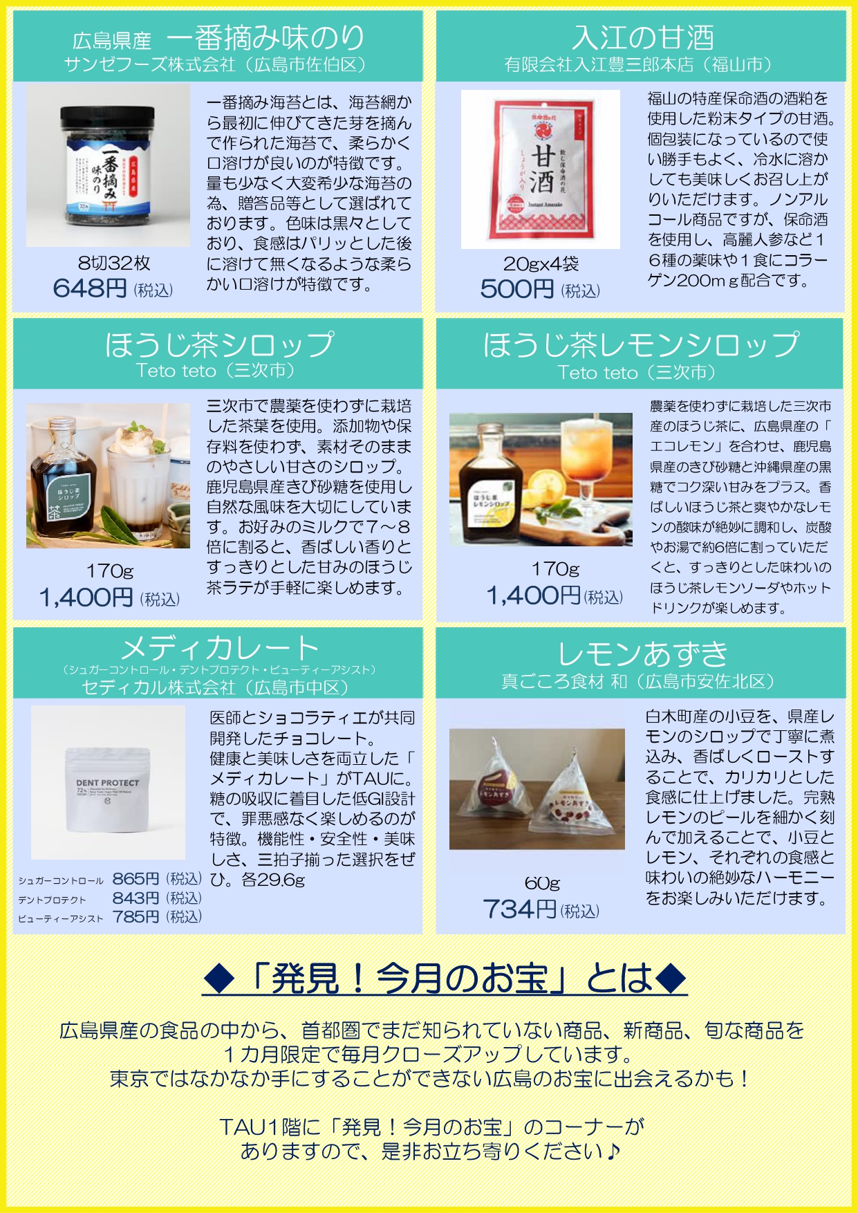 アンテナショップ1階の「発見!今月のお宝」コーナーでは、広島県産の食品の中から、首都圏でまだ知られていない商品、新商品、旬な商品を1ヶ月限定で毎月クローズアップしています。そんな「今月のお宝」商品をオンラインストアでも。どうぞこの機会にお試しください。