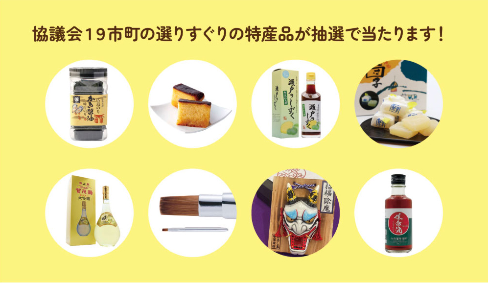 かけ二段仕込み熟成三年醤油(大崎上島町)、広島プレミアムチョコラ4個入り(三原市)、安芸高田ミニ神楽面般若(安芸高田市)、極上ビーフ伽哩×2袋セット(神石高原町)