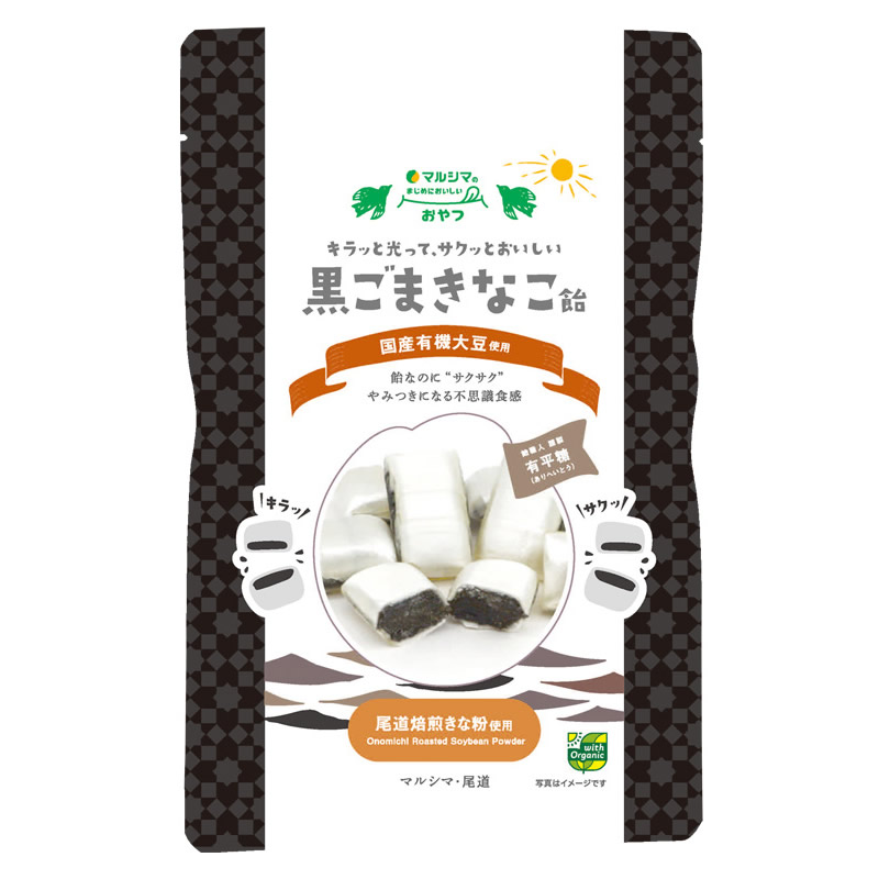 純正食品マルシマ【黒ごまきなこ飴】 尾道のきな粉工房で焙煎された、国産の有機きな粉と黒ごまを贅沢に使用。きな粉と黒ごまの味わいたっぷり。 |