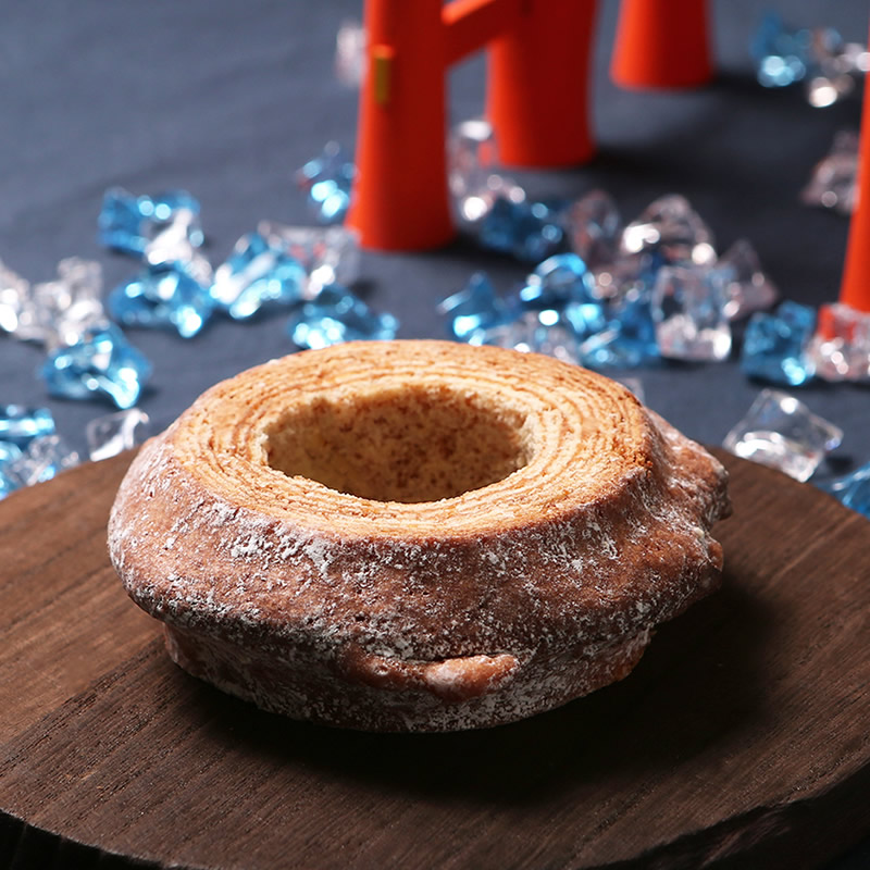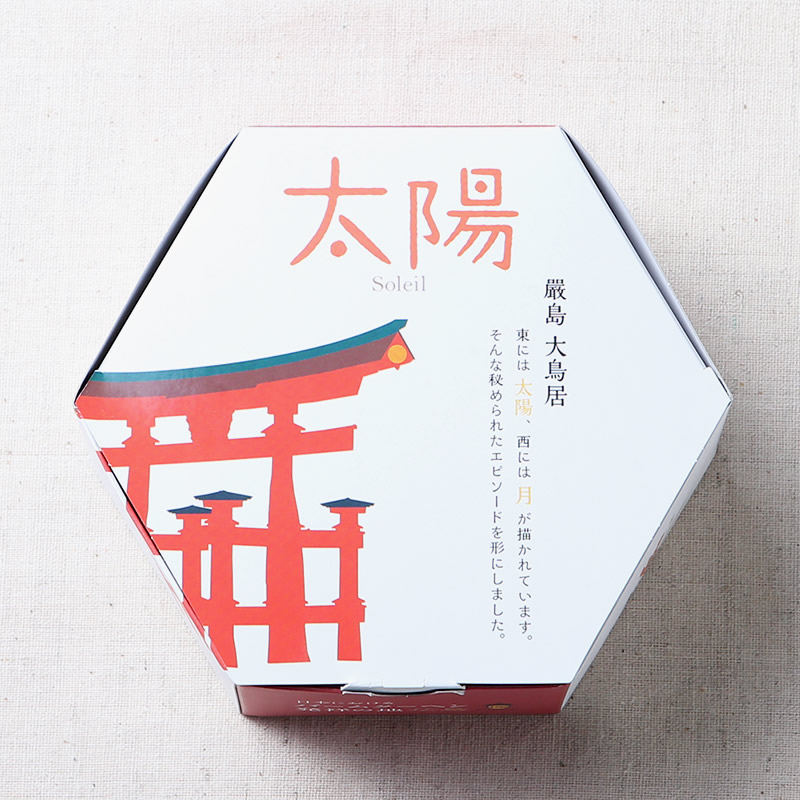 世界遺産でもある宮島の厳島神社の大鳥居の西側には「月」、東側には「太陽」の紋様が描かれています。その「太陽」をモチーフにハードな食感に仕上げたバームクーヘンが「太陽」になります。