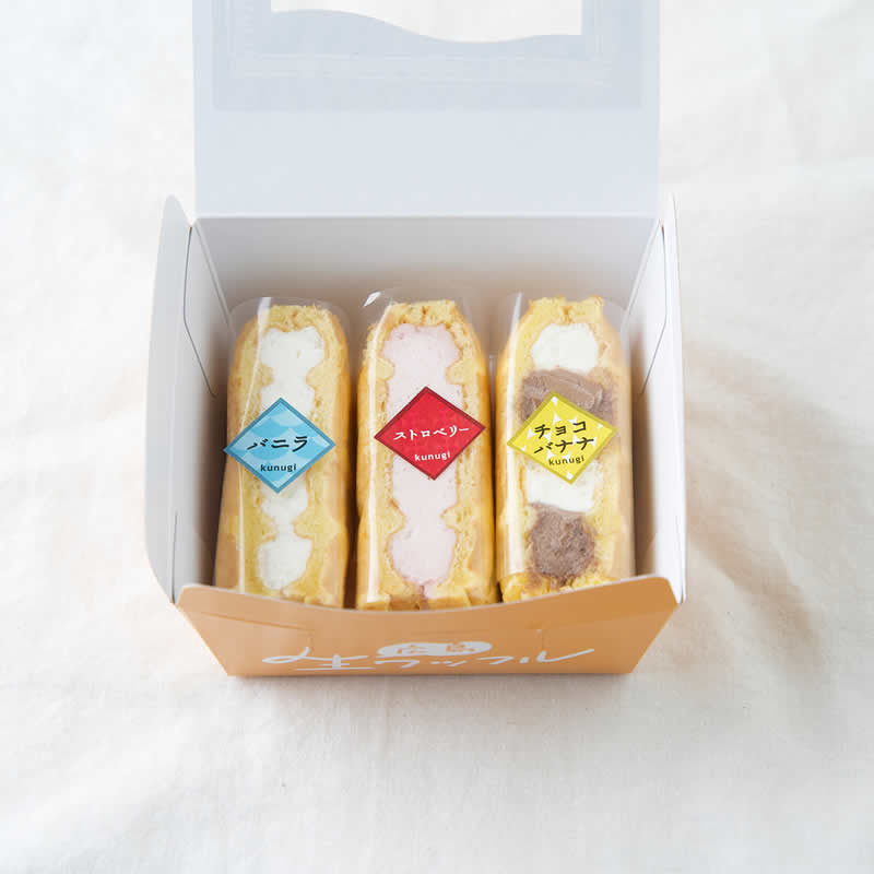 広島県産の米粉と卵を使って焼き上げた”ふんわり・柔らか“なワッフル生地に、季節の素材を織り込んだクリームをサンド。人気のワ3種(チョコバナナ、バニラ、ストロベリー)の詰め 合わせ。解凍後は冷蔵保管し解凍日含め2日以内にお召し上がりください。