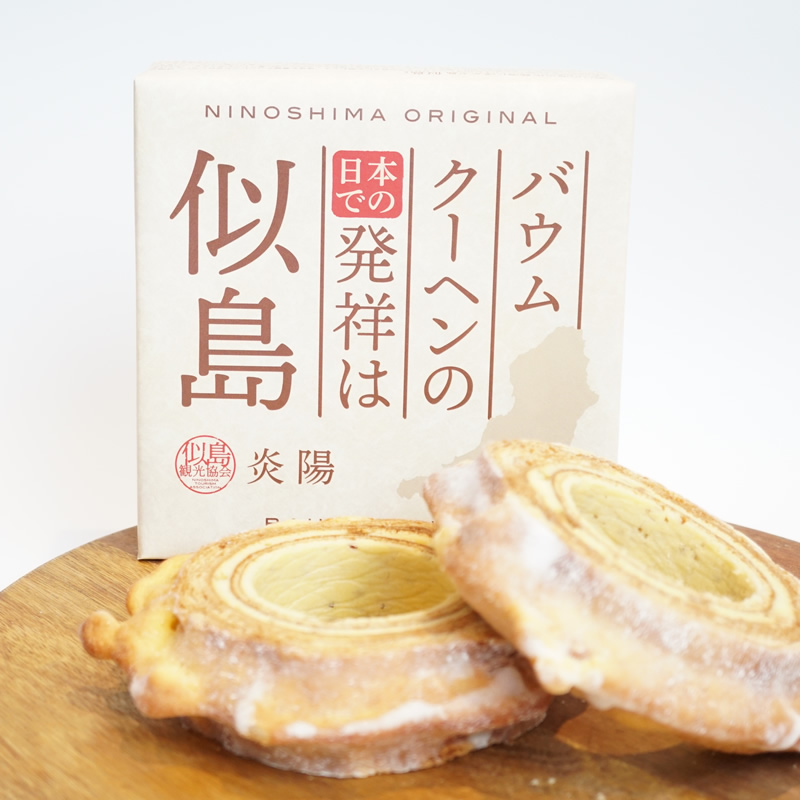 日本のバウムクーヘン発祥の地である広島・似島の物語を現代に伝えるために生まれた商品です。その知られざる歴史を“味”として楽しんでいただけるよう、バターの風味香る、外はカリッと中はしっとり食感にこだわって仕上げました。